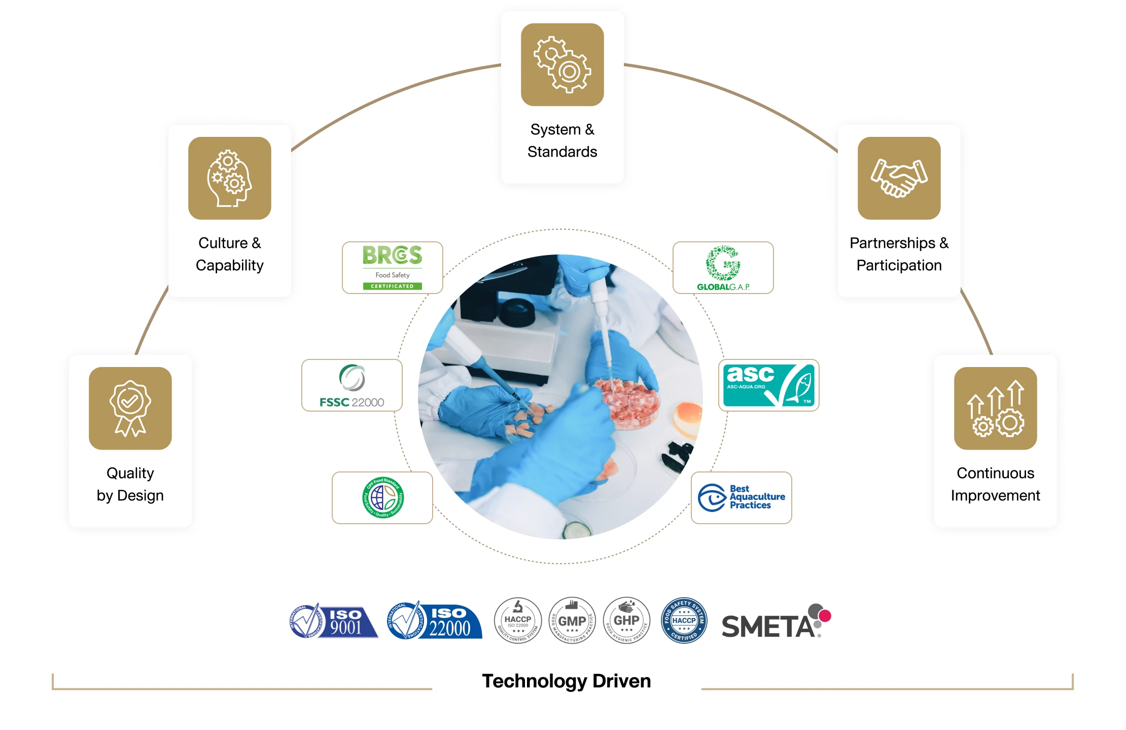 | GMP, GHPs, HACCP | ISO 9001 | ISO 220000 | ISO 17025 | Global GAP | BAP, ASC | AI Compartmenti | FAMI QSii | SMETA | CPF Food Standard | |